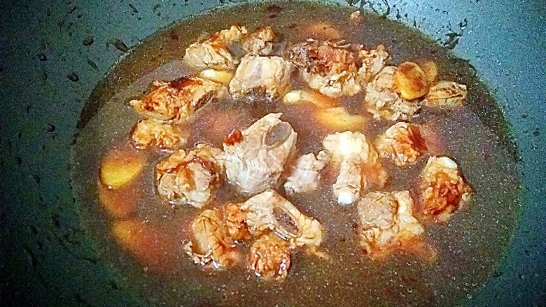12. 放入没过排骨的水量,大火煮开,转中火炖煮