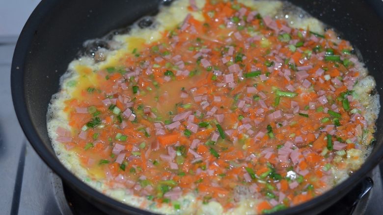 7. 切好的火腿粒,韭菜粒,焯过水的胡萝卜粒都放在碗中,跟蛋液拌在一起。