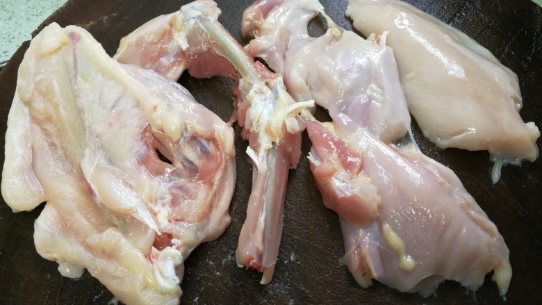 1. 把光鸡的鸡胸、鸡腿分切下来,剥去鸡皮。