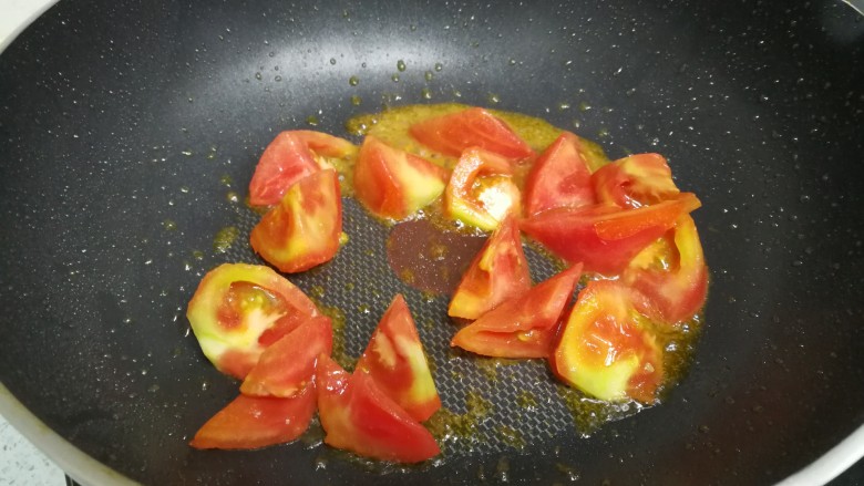 9. 利用锅里余油,倒入去皮切成小块的西红柿,加一点盐,翻炒至出沙,盛起。