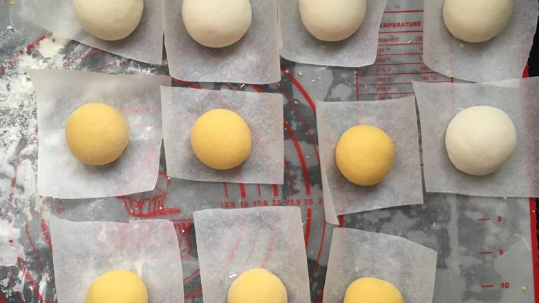 7. 白色面团分为25克小剂子,分别揉匀滚圆,黄色面团分为28克小剂子,揉匀滚圆,白色面团还多余16克备用