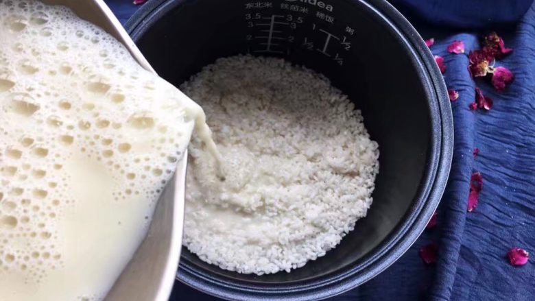 10. 泡水的大米清洗几次后,沥干水分,倒入适量豆浆。