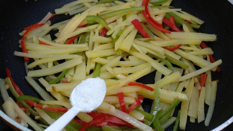 土豆丝与辣椒搭配,加入少量醋烹饪,略带微辣,酸溜溜口感,开胃爽口,是不错的快手下饭菜!