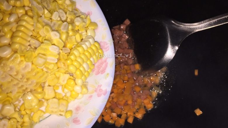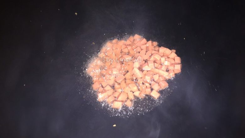 6. 然后炒锅烧热后放入适量食用油烧热,倒入火腿丁翻炒
