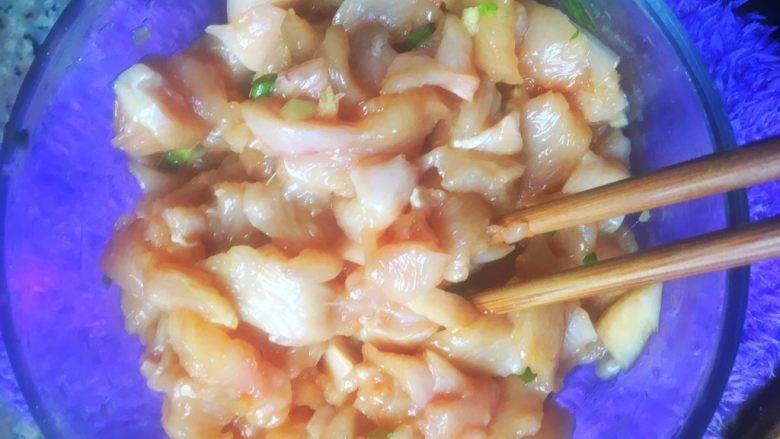 4. 将切好的食材中放入盐、料酒、生抽、葱姜蒜末先腌制十分钟。