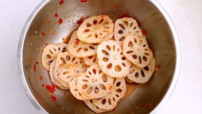 7. 把焯好的藕片放入一个大盆里,加入花椒油