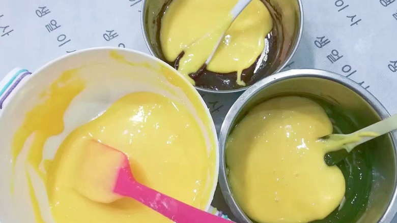 5. 蛋黄糊分成3份,取一份加入抹茶粉液体翻拌均匀,另一份加入可可液体翻拌均匀;