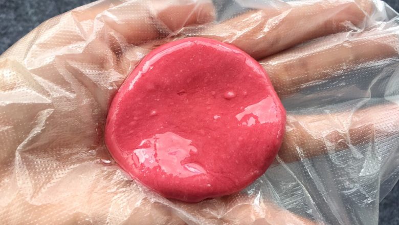 9. 少量多次添加火龙果汁与糯米粉搅拌均匀。