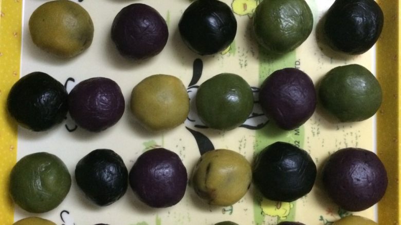 桃山皮月饼是月饼中最容易操作的,对喜清甜的人来说,这款月饼最适合的。颜色也很好搭配,喜欢什么色彩自己用天然材料调配成浓淡深浅的多种色彩,对颜控的我来说,我就喜欢美美的不同色调,不过我简单做了四种不同颜色的,分别是紫苏、墨云、竹青、鹅黄,内馅也是4种,是凤梨、红豆沙、红豆颗粒豆沙、巧克力提拉米苏,月饼50克/个,皮馅比例2:3。