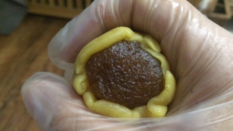 10. 开始包馅了,带上手套操作,皮压成圆饼形。