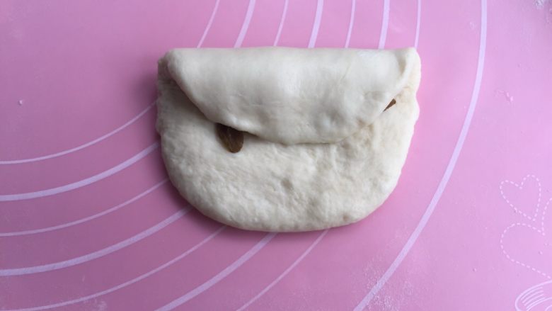 4. 取一个松弛好的面团擀成圆片。上面放上葡萄干。