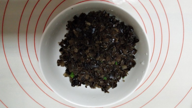27. 把切好的韭菜,切碎的鸡蛋碎和木耳碎一并倒入锅里