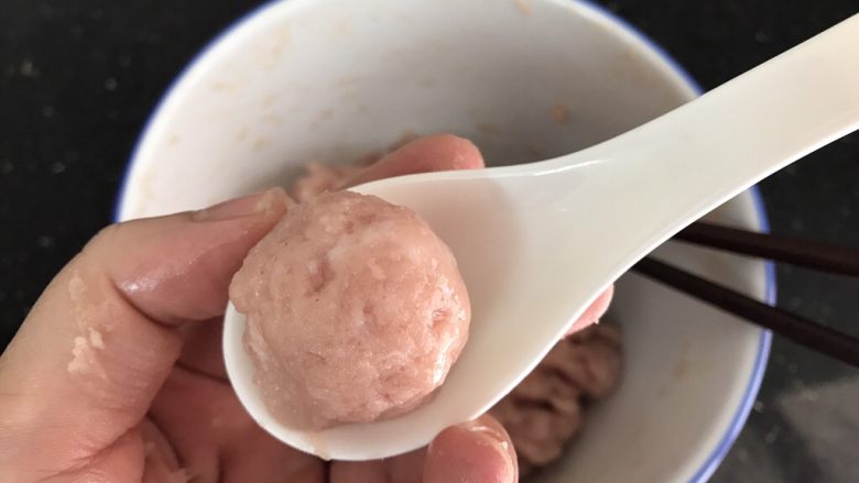 10. 手抓一团肉泥,用虎口处往上挤出一个小丸子