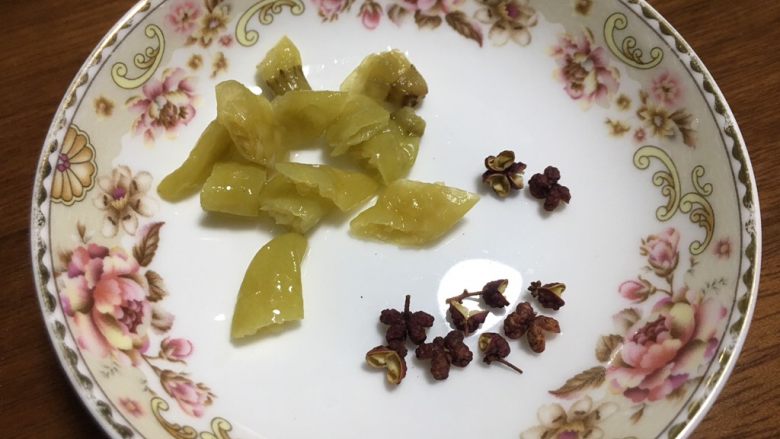 6. 泡椒切小,再拿上剩下的花椒,这些可以让鸭舌增加风味,不喜欢的也可以不加