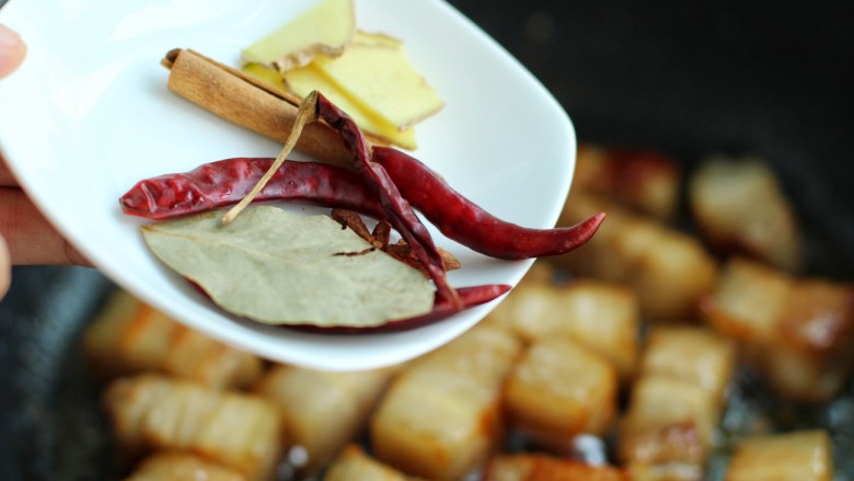 - 加入冰糖这一步是化糖色,一定要用小火来回翻炒至冰糖融化,不要糊了,否则红烧肉会发苦