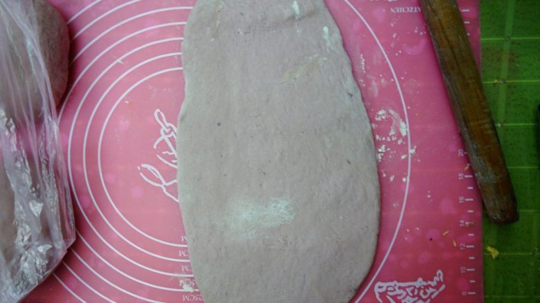 10. .取一个松弛好的面团,用手拍打成圆形,气泡拍掉,擀成椭圆形