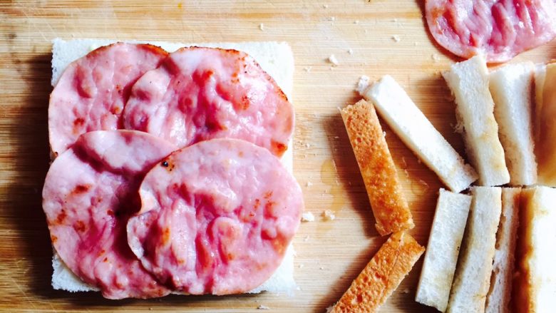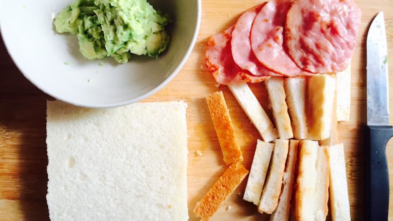 1. 准备材料:吐司去边,牛油果压成泥,美式火腿肉煎熟,备用