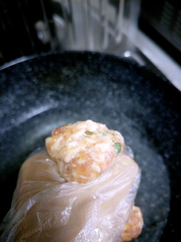 10. 锅内烧水,戴上一次性手套,用手摔打一下肉馅