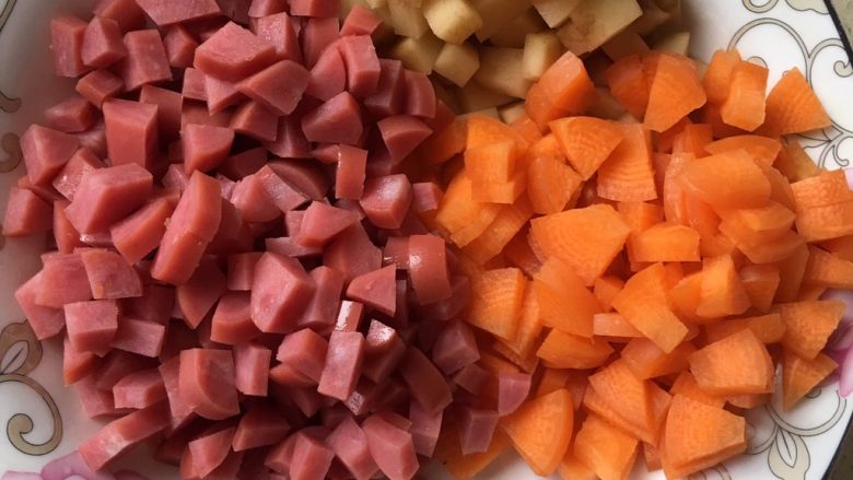 9. 炒出洋葱香味倒入土豆胡萝卜及烤肠丁。