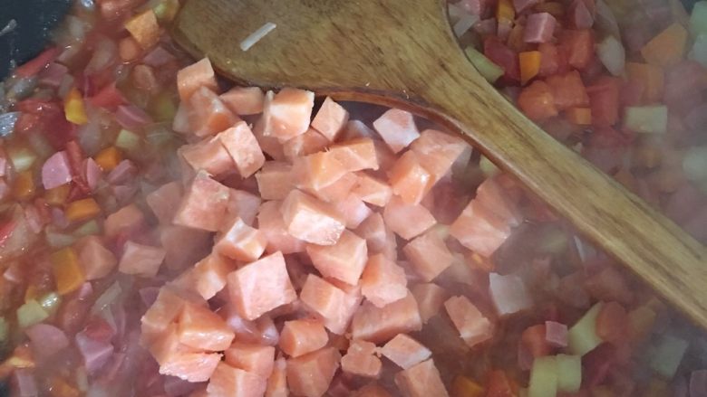 11. 继续翻炒放入一些水,盖上盖子焖上,土豆胡萝卜软了,倒入三文鱼。