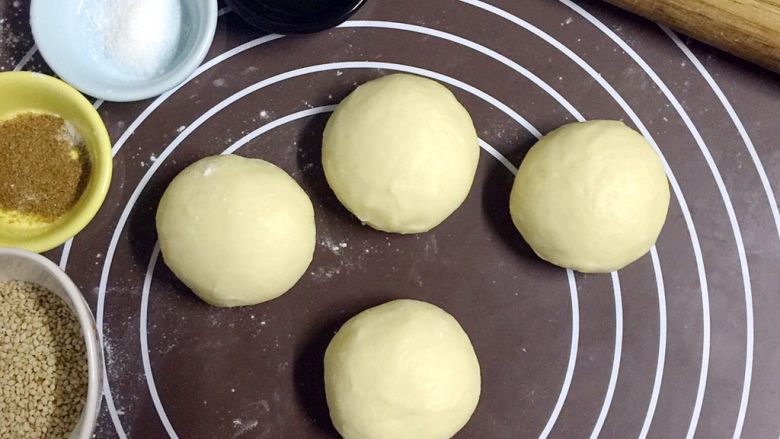 2. 将大面团分割成四个58克左右的小面团 我的烤箱比较小,一次最多能做五个 方子给出的是四个的量,请根据自家烤箱大小调整面粉用量及配料用量