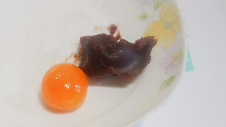 6. 将称好的馅料搓圆压扁,我做了豆沙跟莲蓉两种馅料,放上咸蛋黄,用馅料把咸蛋黄包起,记住用虎口慢慢推,包裹均匀。最后揉圆。