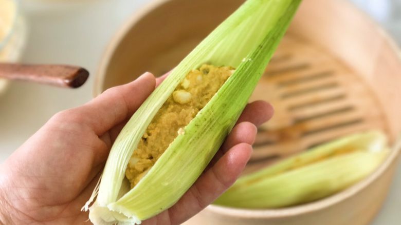 12. 然後將玉米泥小心地放入清洗過的玉米葉子里,輕輕的裹起來,不要露出玉米,這樣在蒸的時候可以充分裹住玉米的味道。葉子長出的部分可以稍稍剪掉一些。