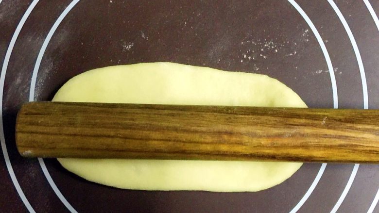 7. 用擀面杖与面团垂直摆放,滚动擀面杖,使面团擀成扁椭圆状
