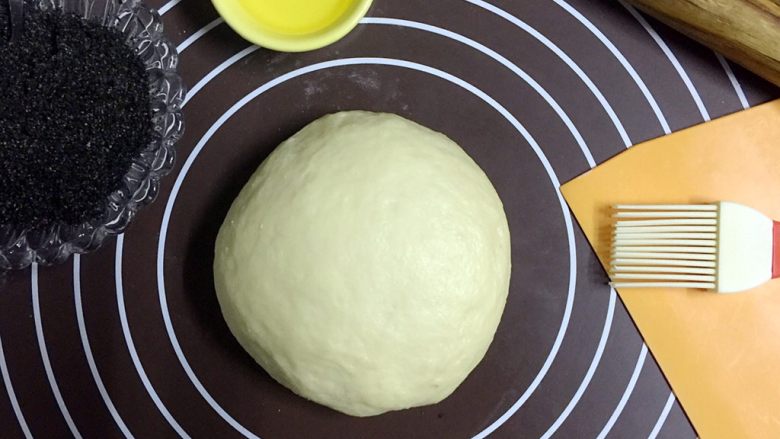 4. 面包面团经过1个小时左右的揉面、一次发酵后,取出,排气揉圆