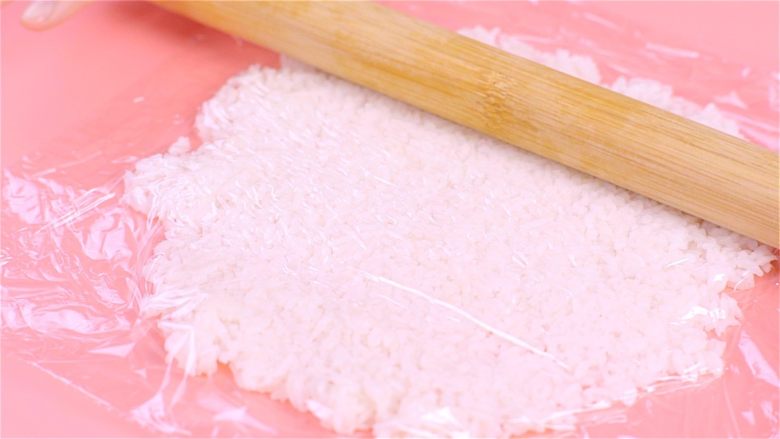 2. 用擀面杖将米饭擀平,碾压出粘性