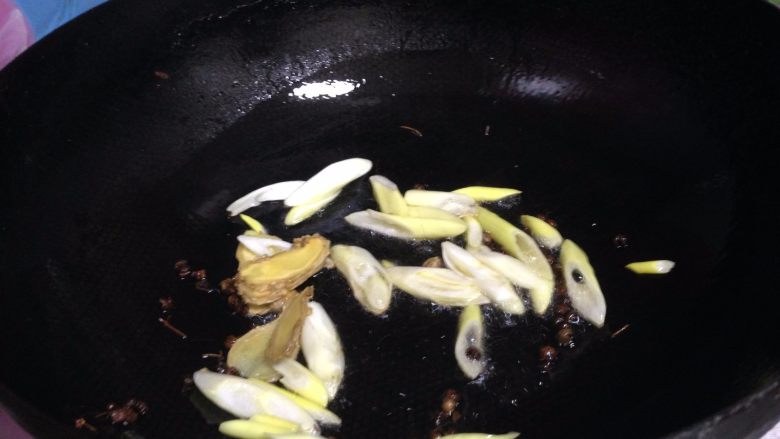 12. 倒入葱、姜炒出香味