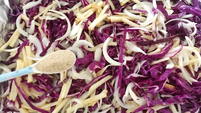 13. 撒入少许糖(也是按各家的口味,不喜欢甜口的也可以省略,因为已经有苹果的甜度,也可以调出紫甘蓝的鲜度啦),