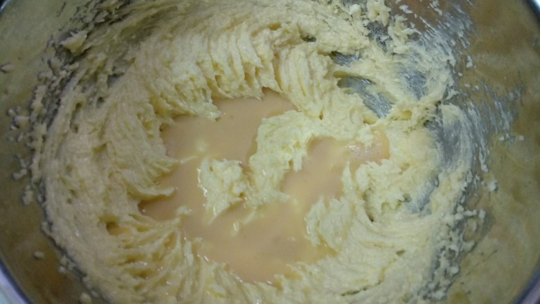 6. 加入鸡蛋液,再用打蛋器打充分均匀。