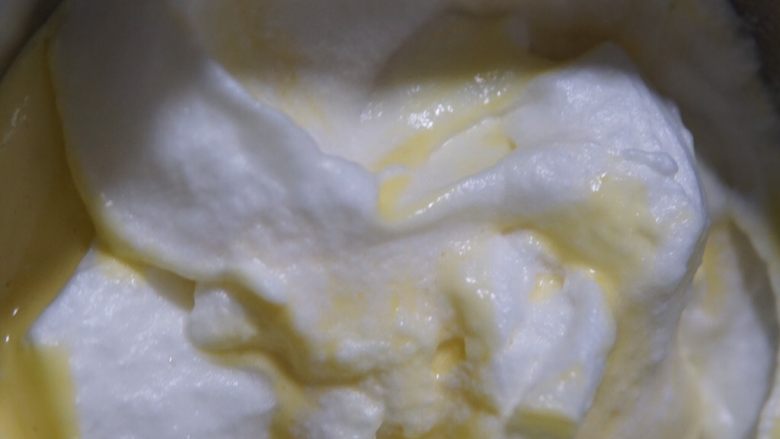 24. 翻拌好的蛋黄糊全部倒入蛋白内