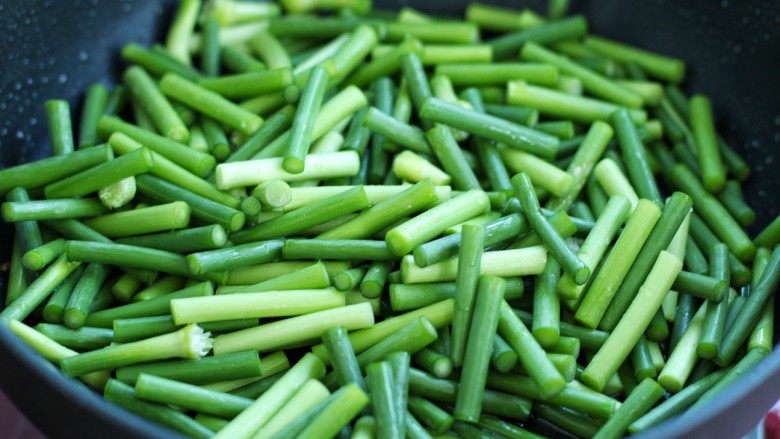 6. 蒜苔洗净切成长度约四厘米的小段备用