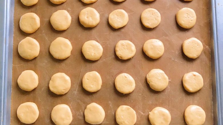 14. 依次一个个均匀码好,饼与饼之间保持一定的距离,如图。这个时候预热烤箱,180度
