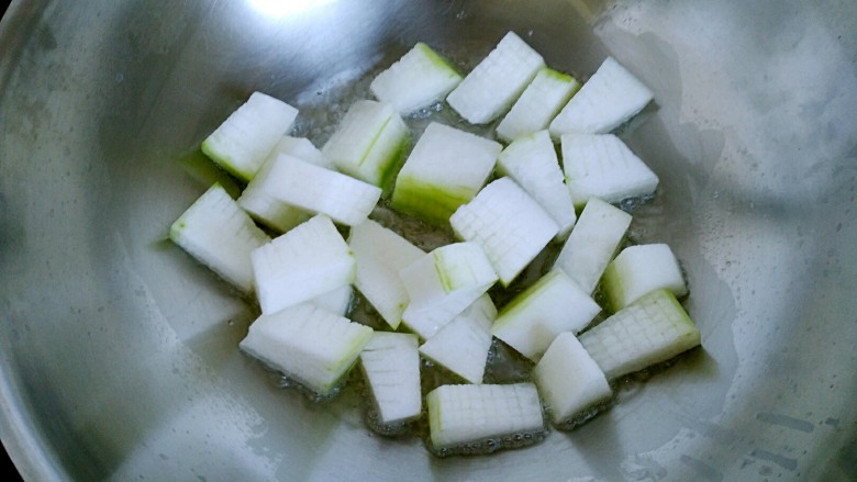 6. 待油温七八分热时,放入切好的冬瓜块儿。