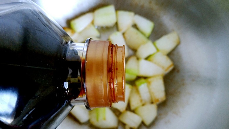 7. 把冬瓜块儿煎至微微金黄色。