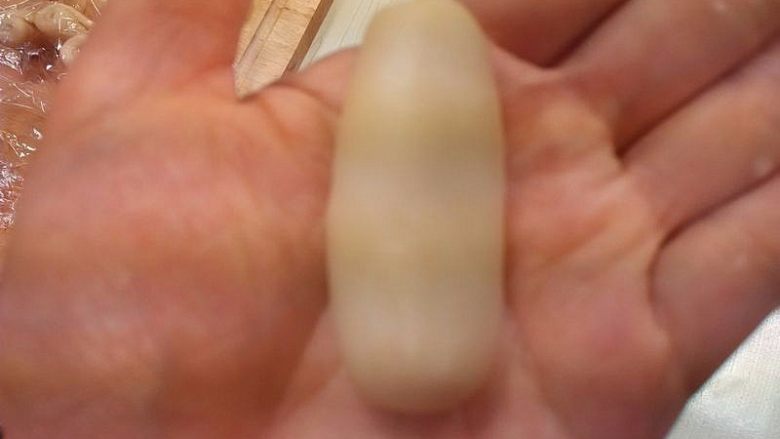 11. 包入一个10克左右的莲蓉馅,把收口向上收紧(不要包包子的捏法);