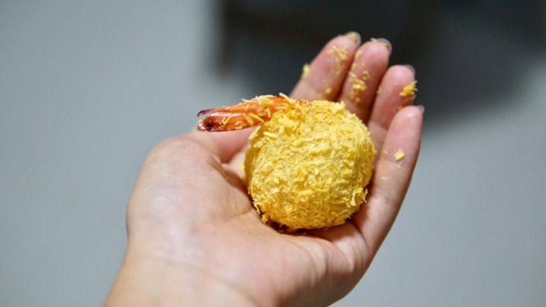 22. 滚好鸡蛋液的土豆虾球滚一层面包糠