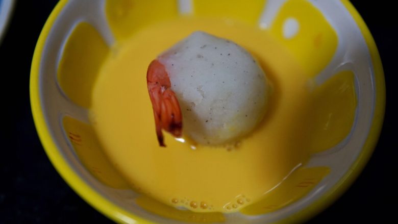 20. 做好的土豆虾球放入鸡蛋液滚一圈