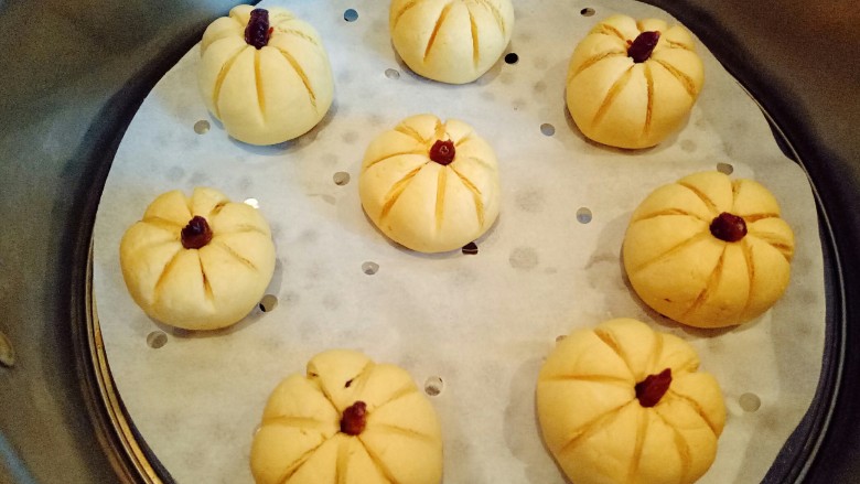 13. 蒸锅中加入冷水,整屉上垫上油纸。(每个南瓜饼下面放一片胡萝卜也可以,大火水烧开后,蒸6-8分钟即可出锅。