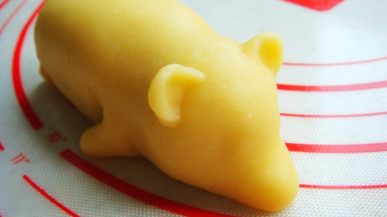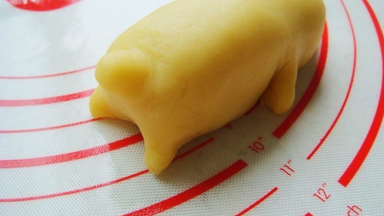 10. 身体两侧用刮板切出两部分做脚掌。(切口深度不露出香肠就可以)