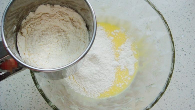 3. 泡打粉倒入面粉中混合,筛入盆中。