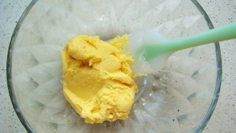 4. 用刮铲搅拌均匀,这时候面团会有点粘,盖上保鲜膜放入冰箱冷藏半个小时就好了。
