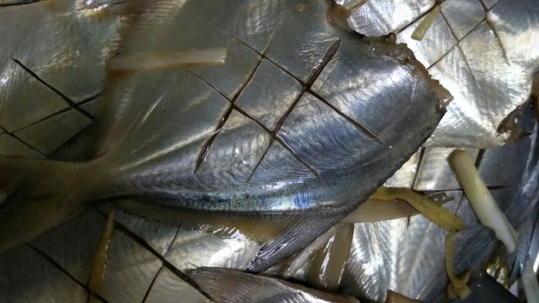 1. 正逢刚开海,新鲜的鲳鱼内脏处理干净,家里人不吃鱼头,所以一起去掉