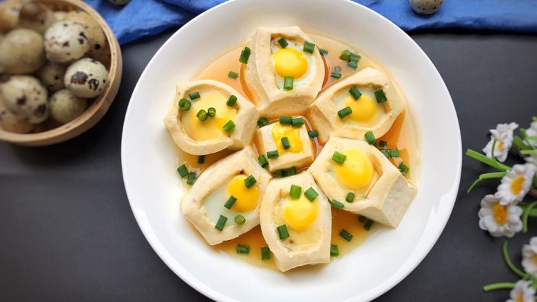 10. 再每个豆腐盅里敲入一个鹌鹑蛋
