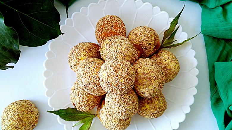 21. 一份为例 包好枣泥酱的面球裹满白芝麻