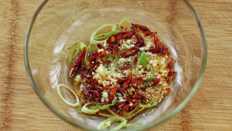 6. 加热锅中炸花生米后的食用油,浇倒在所有食材上榨出香味
