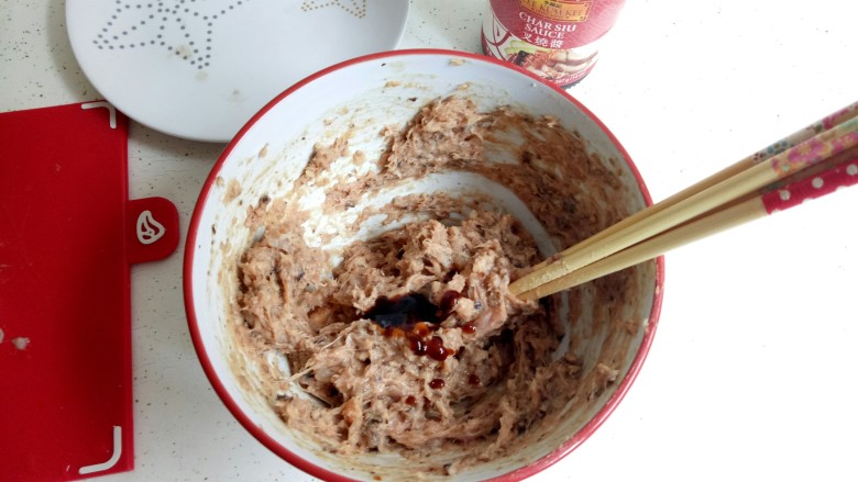 9. 把虾油和肥肉,麻油加入肉团里面。继续搅拌5分钟(有条件的可以把肉放塑料袋里面从高处摔下来20-30次左右,让肉有Q弹)。然后让肉保鲜膜包静置10-20分钟。就可以包咯。可以适量加5-10g的香菇水,太多水也是不行的。会爆开。